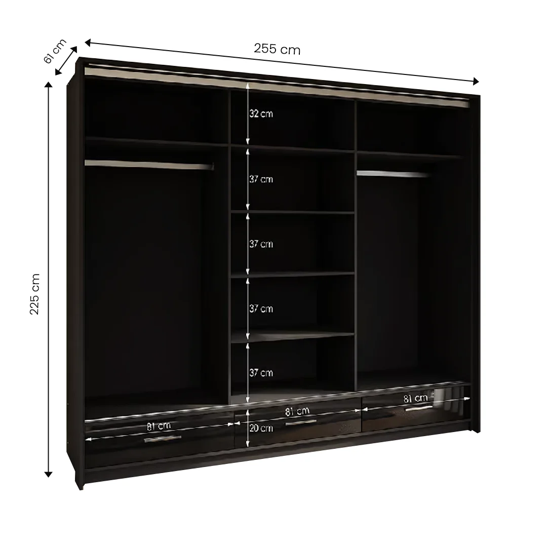 Black Gloss Wardrobe with 3 Mirror Sliding Doors- Marsylia 255cm