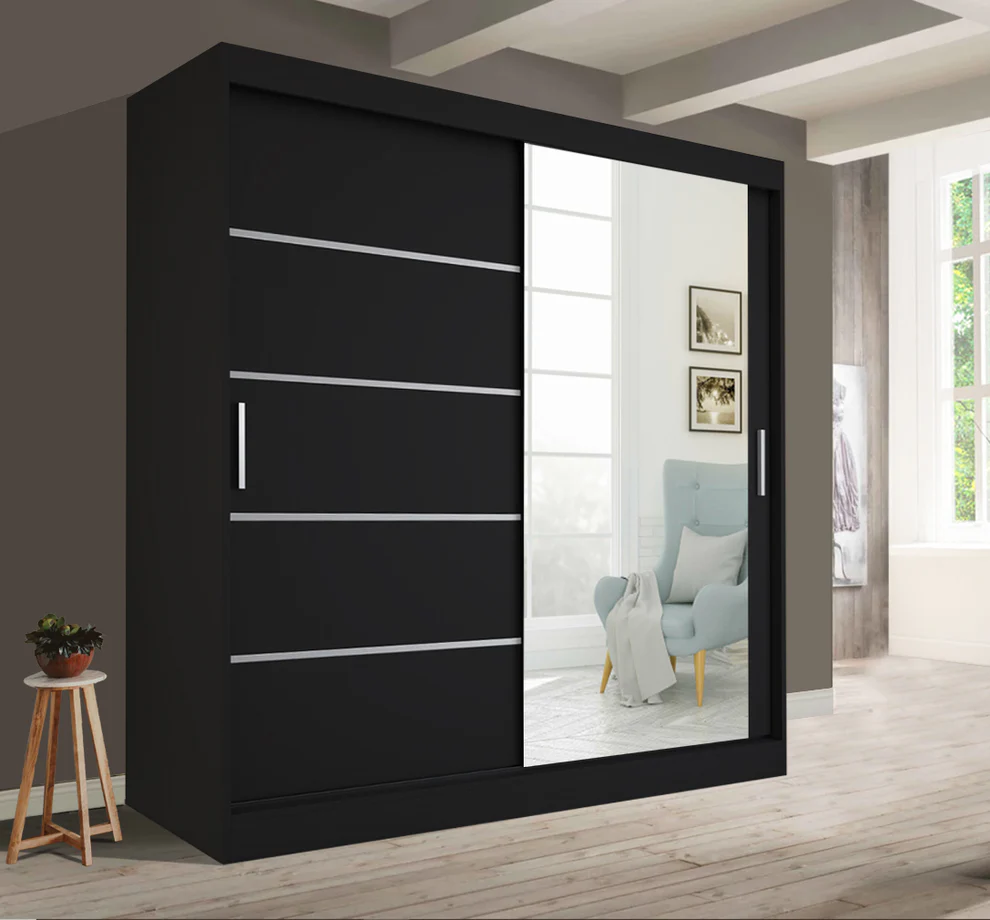 The Lisbon sliding doors wardrobe 150cm features 2 sliding doors, 4 shelves, and 2 hanging rails. Its dimensions are 150cm width, 216cm height, and depth. The Lisbon Sliding Doors Wardrobe is a luxurious and affordable solution for your bedroom needs. Its full-length mirror adds brightness and the illusion of more space, while the elegant horizontal panelled door enhances its beauty and creates a calm atmosphere. This wardrobe is equivalent to four single wardrobes and features eight spacious cubed storage compartments, as well as two large shelves. Crafted from 16 mm laminated particle board, it offers a perfect balance of beauty, stability, and durability. The high-quality sliding mechanism ensures a smooth and noiseless operation, making it a perfect addition to your bedroom.