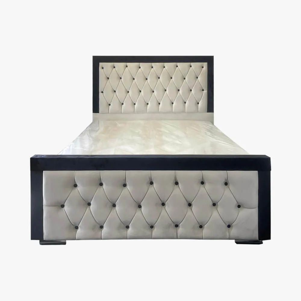 The bed has a stylish Chesterfield design with a high padded headboard and footboard that are both covered with diamonds. The chrome legs with link bars enhance its attractiveness, which also provide strong support.
