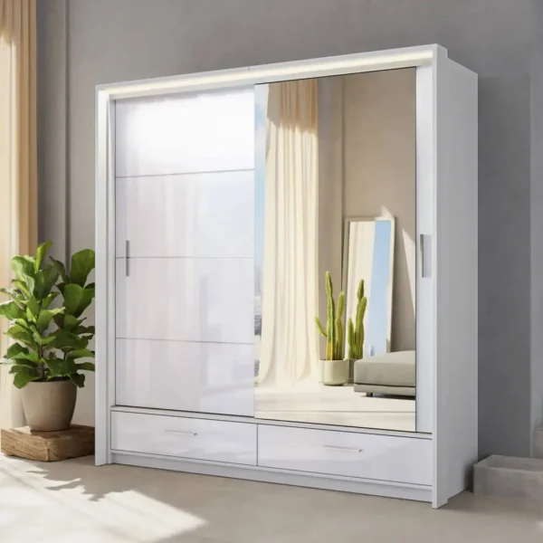 White Gloss Wardrobe with 2 Sliding Mirror Doors – Marsylia 208cm
